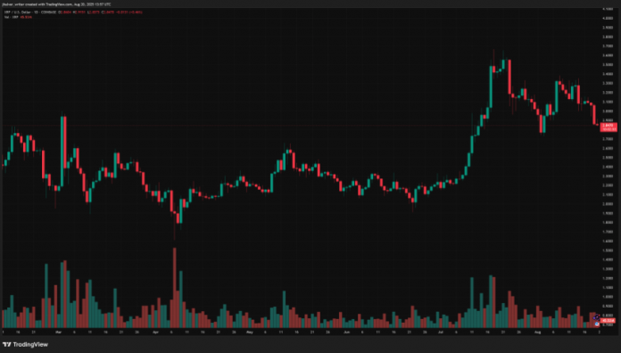 Worth motion information reveals XRP’s sharpest drop occurred between 13:00 and 15:00 UTC on August 19, when it slid from $3.04 to $2.93 as quantity spiked to 137 million, almost double the day by day common.