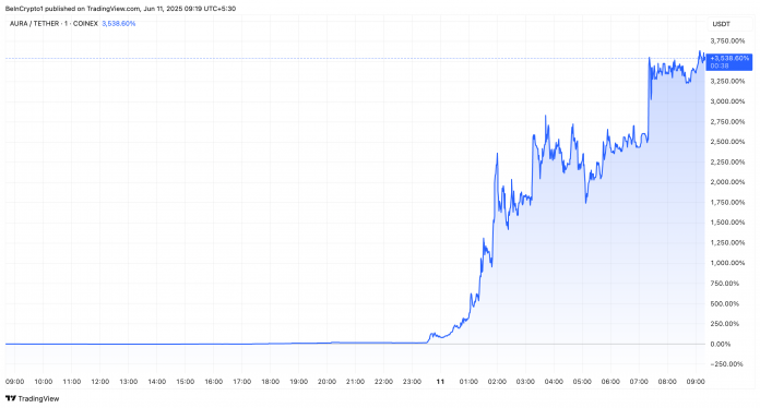 Aura (AURA), a tradition token constructed on the Solana (SOL) blockchain, has skyrocketed by over 3,500% previously 24 hours, marking a rare worth surge.