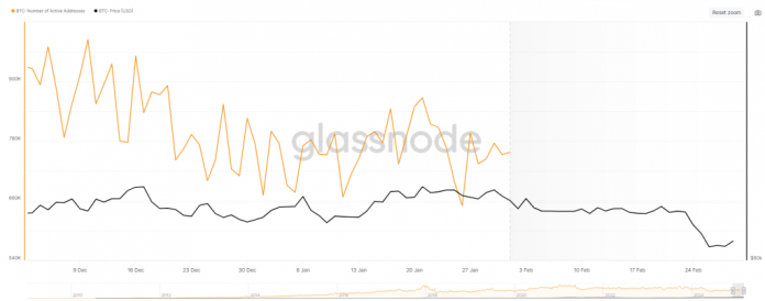 The variety of lively addresses in Bitcoin has elevated, with a peak of 912,300 on February 28. The newest occasion of this degree was on December 16, 2024, when Bitcoin was buying and selling at $105,000, Glassnode information exhibits.