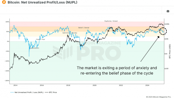 The Internet Unrealized Revenue and Loss (NUPL) is without doubt one of the most dependable sentiment gauges throughout Bitcoin cycles. As value fell, NUPL dropped into “Anxiousness” territory, however following the rebound, NUPL has now reclaimed the “Perception” zone, a essential sentiment transition traditionally seen at macro larger lows.
