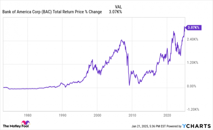 There’s quite a bit to love in Financial institution of America. It is nonetheless one of many world’s largest banks and can seemingly continue to grow alongside the U.S. economic system. Analysts count on roughly 10% annualized earnings progress over the subsequent three to 5 years. The corporate pays a secure dividend that yields 2.2% at the moment, making it a strong holding in a diversified portfolio. And, for those who purchased and held via all of the ups and downs, the inventory has returned over 3,000% because the early Nineteen Seventies.
