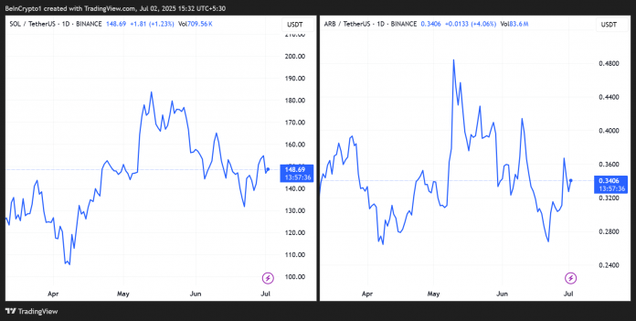 Regardless of main catalysts like Solana transferring nearer to a staked ETF (exchange-traded fund) launch, and Robinhood’s integration of Arbitrum, each SOL and ARB altcoins barely moved.
