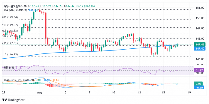 The Japanese Yen (JPY) maintains its supplied tone via the primary half of the European session on Monday, which, together with a pickup within the US Greenback (USD) demand, assists the USD/JPY pair to carry regular slightly below mid-147.00s. Regardless of the Financial institution of Japan’s (BoJ) hawkish outlook, buyers stay unsure over the possible timing of the following rate of interest hike. This, together with the prevalent risk-on atmosphere, undermines the safe-haven JPY. The USD, however, advantages from diminished bets for a extra aggressive coverage easing by the Federal Reserve (Fed).