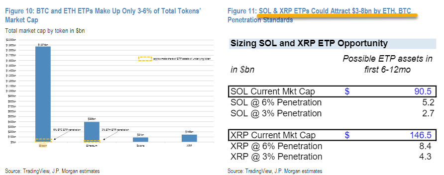 JPMorgan Chase expects that potential Solana (SOL) and XRP exchange-traded funds (ETFs) might see multi-billion greenback inflows.