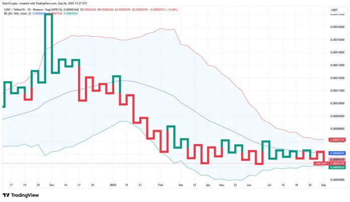 Notably, this has served a staggering hit on Terra Luna Traditional’s (LUNC) already sluggish buying and selling quantity. Whereas not reaching above $100 million on common every day, at this time’s LUNC buying and selling volumes have barely exceeded $11 million, hinting at additional downturns. One other regarding issue is the altcoin’s incapability to reclaim the middle-tier blue Bollinger Band (BOLL).