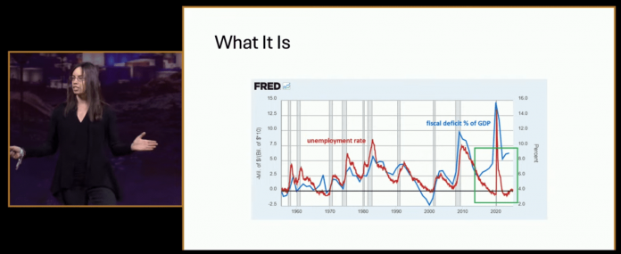 Her first chart, sourced from the Federal Reserve’s FRED database, displayed a stark decoupling: the unemployment price is down, but the fiscal deficit has surged previous 7% of GDP. “This began round 2017, went into overdrive throughout the pandemic, and hasn’t corrected,” Alden stated. “That’s not regular. We’re in a brand new period.”