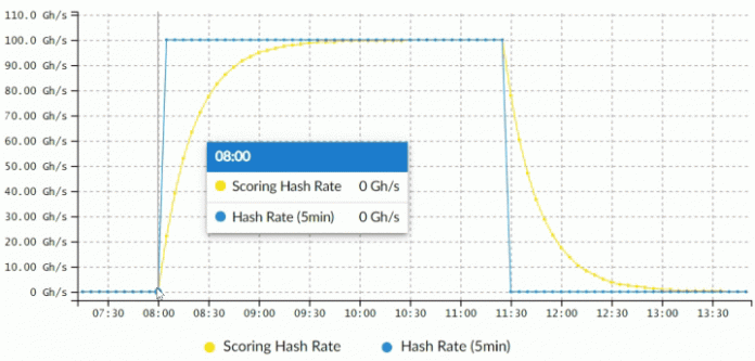 As proven on this archived web site of how Rating labored, you possibly can see that after 90 minutes your hashrate had no extra presence on the pool. Because of this the second a miner begins mining, their share of rewards pretty rapidly reaches the truthful worth of the hashrate. Alternatively, when a miner stops mining, it drops equally quick, as proven on the gif beneath.