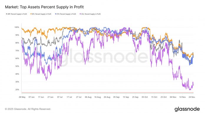Glassnode’s P.c Provide in Revenue information for ETH, XRP, and SOL exhibits a continued decline since October.