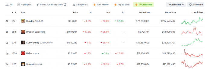 A chunk of reports by Bitcoin Harber threw gentle on Sundog, launched on SunPump, which rapidly hit a $200 million market worth in only one week. This increase brought on TRON’s value to leap by 12% within the final 24 hours, whereas Sundog’s worth shot up by 237% over the week. Because of this, rivals like Solana are falling behind.