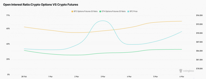 Value efficiency in March additional highlights the divergence. Bitcoin’s worth will increase from $84,413 on March 1 to $90,624 on March 6, a 7.4% achieve, regardless of volatility with a peak at $94,238 on March 3 and a dip to $86,212 on March 4. Beginning at $2,216, Ethereum’s worth rises to $2,297 by March 6, a 3.7% achieve, however experiences a sharper drop from $2,519 on March 2 to $2,145 on March 3. Bitcoin’s stronger internet achieve and better volatility align with its rising choices/futures OI ratio, as merchants seemingly use choices to capitalize on or hedge towards these swings.
