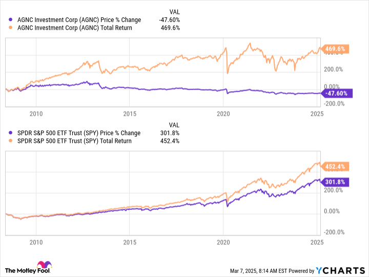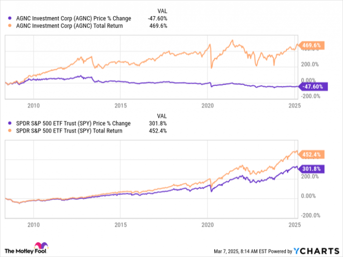 From its inventory market debut in 2008 via March 6, 2025, AGNC’s inventory worth has declined by about 47.6%. By returning heaps of income to shareholders as dividends, although, it has produced a whole return of 470% since that debut. That is a bit higher than buyers would have carried out with an S&P 500 index fund over the identical interval.