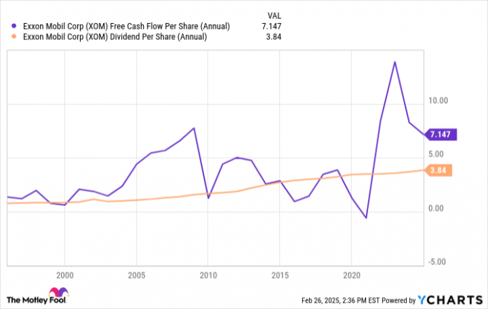 Transcending its historical past of 42 consecutive years of dividend raises, ExxonMobil has rewarded shareholders with a dividend for greater than a century — an encouraging signal that paying dividends is embedded within the company’s identification. With ample operations that reach all through the vitality worth chain, ExxonMobil generates sturdy free money stream, even amid volatility in vitality costs, from which the corporate has oftentimes been capable of supply its dividend funds over the previous 30 years.