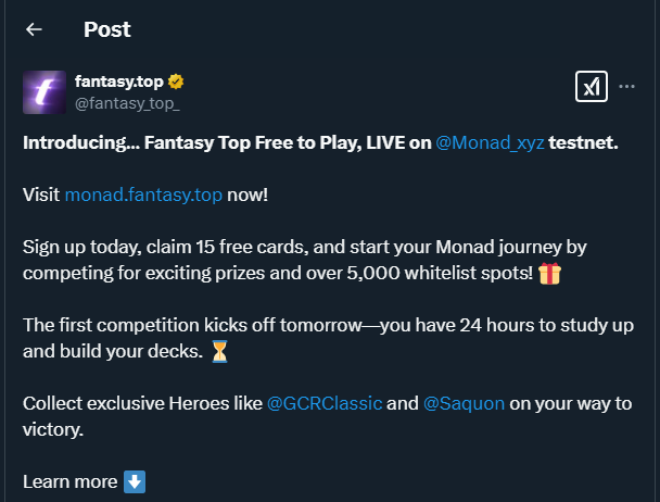 Fantasy Prime, a recreation that transforms influential Crypto Twitter personalities into playable fantasy characters, is increasing from Ethereum’s layer-2 Blast to the testnet of Monad, an rising layer-1 blockchain. The transfer aligns with Fantasy Prime’s technique to improve accessibility, leverage Monad’s high-speed transactions, and discover new methods to gamify social media engagement on-chain.