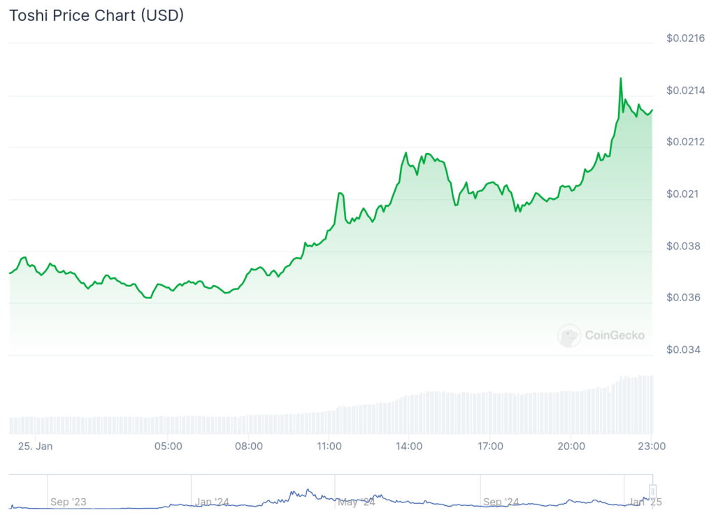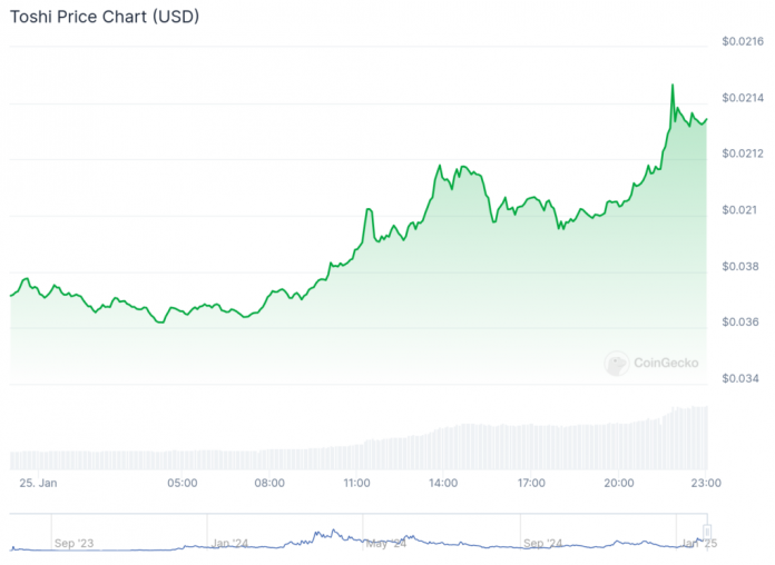 Toshi spiked in worth, pushing its market cap to greater than $264 million.