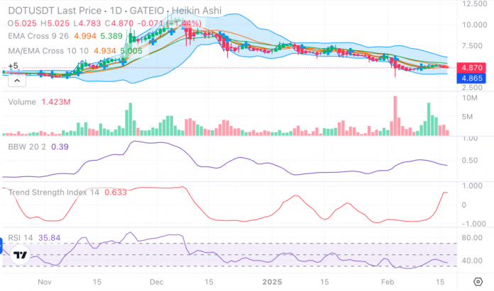In the course of the previous 3 months, Polkadot was one of many major performers after gaining by 130%. The worth of DOT, one of many main altcoins, down by 3.6% in the course of the previous 24 hours. This reveals that it has maintained its go-dowm momentum regardless of different cryptocurrencies shedding a lot inside the interval. Usually, DOT has benefited from the euphoria surrounding Trump’s victory and the prospect of a brand new SEC chairperson. At press time, commerce DOT’s perpetual contract at $4.89 DOT/USDT on Gate.io. The graph under reveals DOT’s present value outlook.