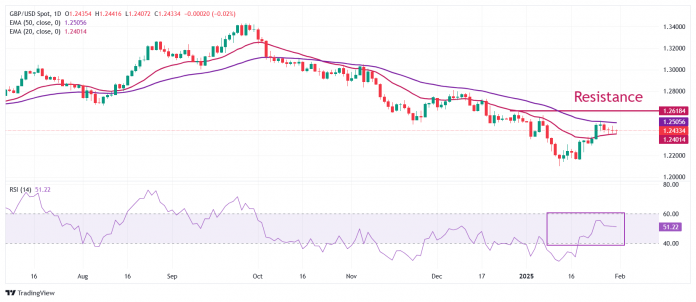 The Pound Sterling has held the important thing help of 1.2400 in opposition to the US Greenback since Monday. The near-term outlook for the GBP/USD pair stays agency as it holds the 20-day Exponential Transferring Common (EMA), which trades round 1.2400. Nevertheless, the 50-day EMA close to 1.2510 stays a significant barrier for the Sterling bulls.
