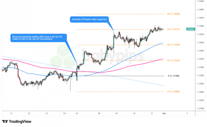 This setup centered on an extended bias and sure delivered exceptionally nicely all through the week. After the unique dialogue, AUD/NZD broke above its October pattern line resistance forward of the CPI launch and was hovering close to the 1.1400 psychological degree and R2 Pivot Level at 1.1394 when the Australian inflation knowledge hit the wires.