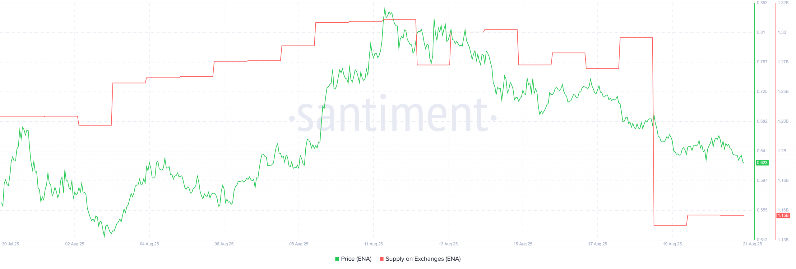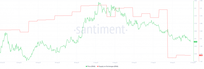 Knowledge from Santiment exhibits that Ethena (ENA) trade reserves fell from 1.3 billion to 1.15 billion throughout the third week of August. In different phrases, 150 million ENA left centralized exchanges.