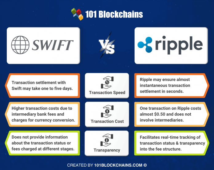 The very first thing in any Ripple vs. Swift comparability is the velocity and effectivity of worldwide transfers. Swift is a messaging protocol and entails a number of middleman banks within the course of. The complicated course of adopted by Swift for worldwide funds is slower and can be affected by many different elements. The worldwide transactions facilitated by Swift might take one to 5 enterprise days for settlement. A few of the different elements that have an effect on the velocity of Swift transactions embody change fee insurance policies of banks, worth of cost and affect of rules.