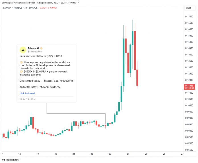 Nonetheless, the token couldn’t maintain its peak for lengthy. On July 24, SAHARA dropped greater than 30% from its excessive. This sharp decline mirrored fast profit-taking by early patrons.