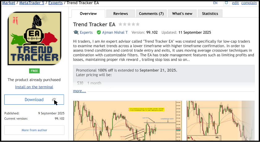 This may take you to the market web page inside MT5 app. You possibly can see the standing of obtain inside journal tab in toolbox window(yellow field). As soon as the obtain is full the EA will seem contained in the Market folder of your Professional Advisor part within the Navigator window (yellow circle). Development Tracker EA efficiently downloaded.