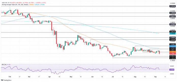 The USD/CHF prolonged its losses on Friday, tumbling beneath the 50-day Easy Shifting Common (SMA) at 0.8020. The discharge of a worse than anticipated US Nonfarm Payrolls report, cemented the case for a Fed fee reduce on the September assembly. On the time of writing, the pair trades at 0.7980, down 0.94%.