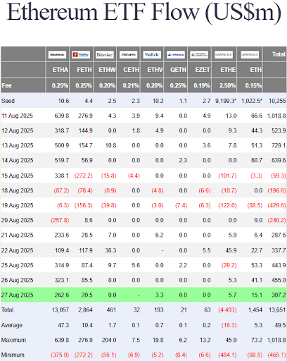 Knowledge from ETF trackers present that Ethereum funds have been posting stronger inflows than Bitcoin ETFs throughout a number of periods in latest days. In response to knowledge from Farside Traders, US-based Spot Ethereum ETFs captured round $307.2 million in internet inflows on August 27, bringing the whole cummulative netflow to $13.64 billion.