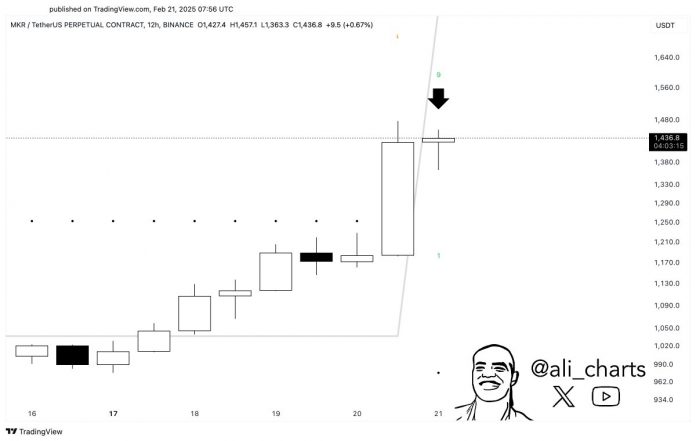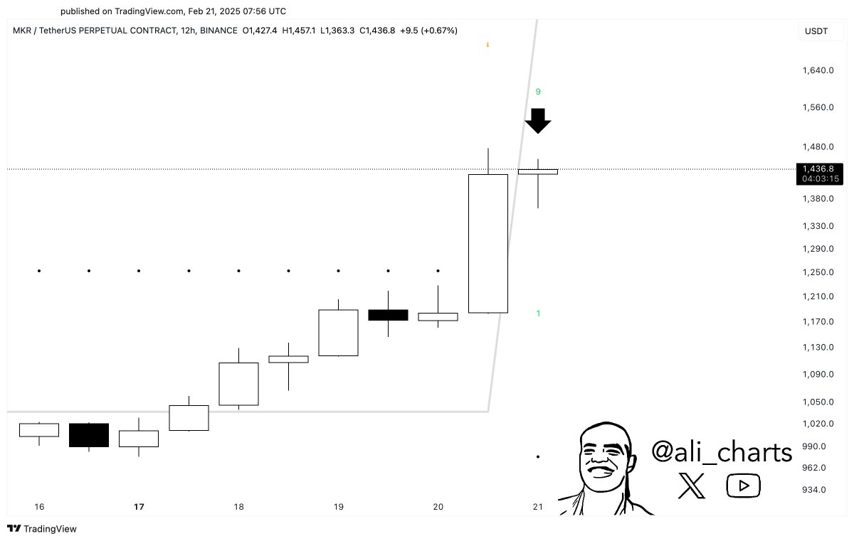 Dealer Ali Martinez tells his 128,100 followers on the social media platform X that MKR’s Tom DeMark (TD) sequential indicator flashed a bearish sign on its 12-hour chart.