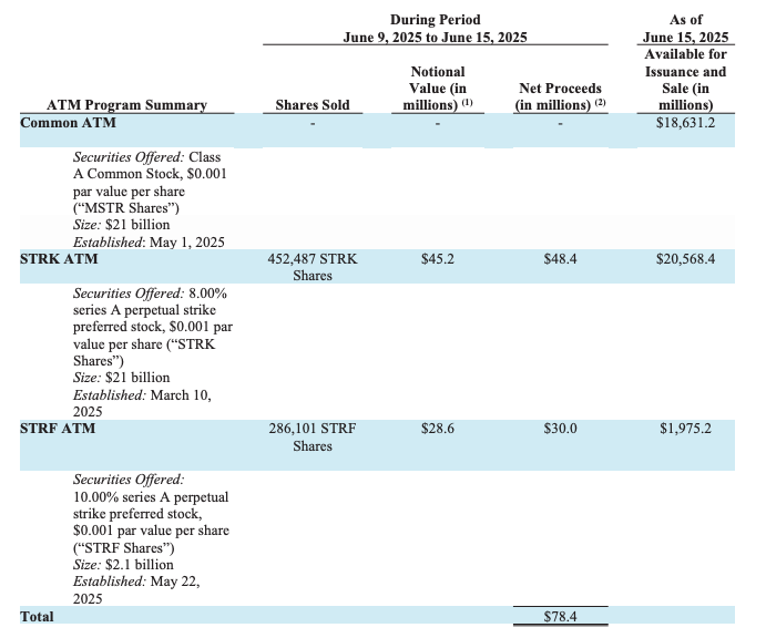 The latest allocation was financed by way of a number of capital raises. Technique tapped its STRK and STRF at-the-market choices, and accomplished a $979.7 million public providing of STRD, its 10.00% Collection A Perpetual Stride Most popular Inventory, on June 10.