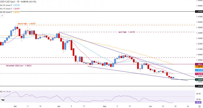 - USD/CAD stays in a descending wedge, whereas the Relative Power Index alerts a pause in bearish momentum.