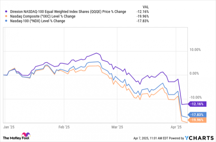 Since the usual Nasdaq-100 is market-cap-weighted, mega-cap tech shares account for an enormous portion of the index, and that has taken a toll on it since these have been among the most affected by the response to Trump’s tariff plans. Apple, Nvidia, and Microsoft make up over 1 / 4 of the index by themselves.