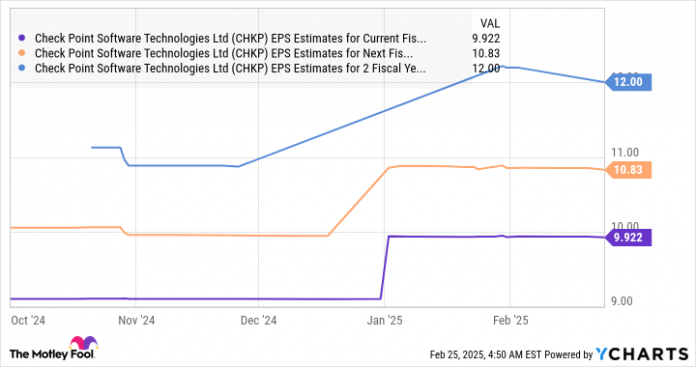 Examine Level is anticipating its fiscal 2025 income to extend within the vary of 4% to eight%. In the meantime, the corporate has guided for barely stronger bottom-line progress to a variety of 5% to 11%. On the midpoint, Examine Level’s full-year earnings might land at $9.90 per share.