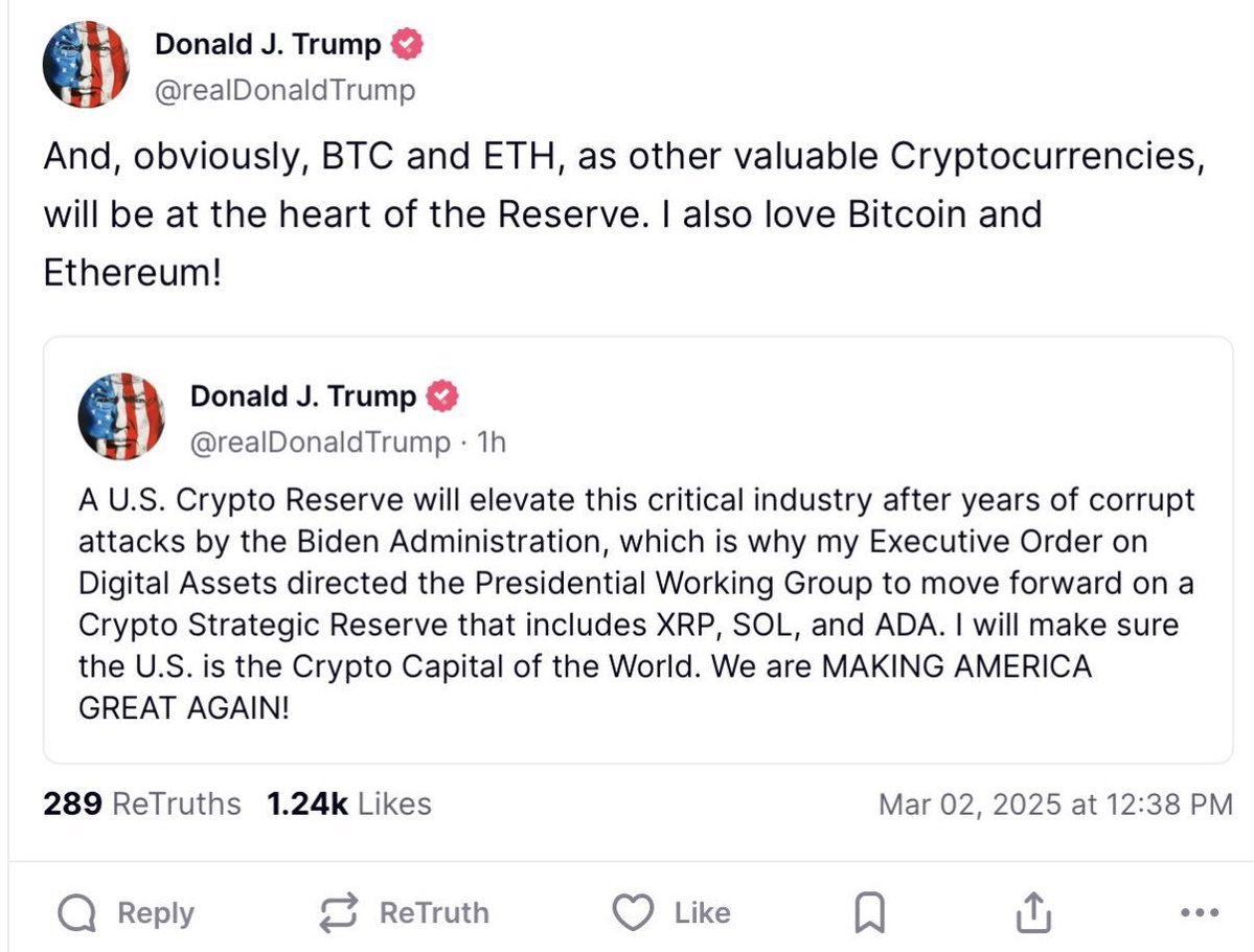 ‘BTC and ETH, present me your strategic worth—for me and the USA. I simply closed a take care of XRP, SOL, and ADA.’”