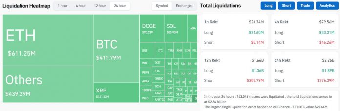 Ethereum merchants suffered probably the most, with complete liquidations hitting $611 million, of which $447 million got here from lengthy positions. Bitcoin adopted intently, with $411 million in liquidations, together with $340 million from lengthy bets.