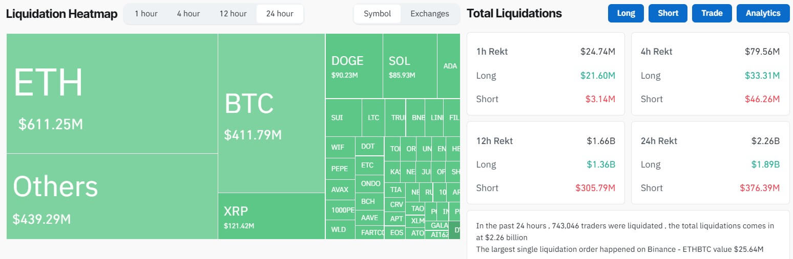 The sharp downturn within the crypto market led to widespread liquidations, wiping out over $2 billion and affecting greater than 742,000 merchants, as per CoinGlass knowledge.