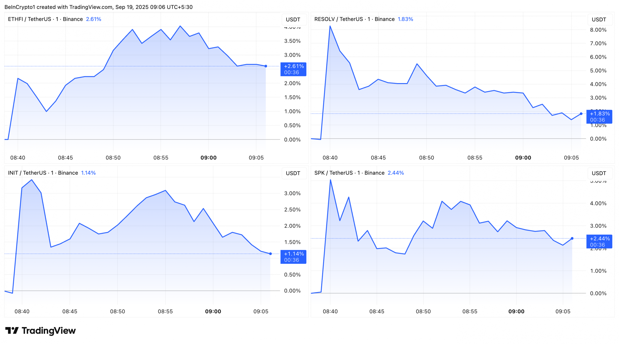 RESOLV noticed the very best beneficial properties of 11.4%, advancing from $0.158 to $0.176. It was final buying and selling at $0.16, nonetheless 1.8% increased. INIT rose from $0.39 to $0.43. This represented a ten.26% leap, earlier than easing again to $0.39, sustaining a 1.1% uptick.