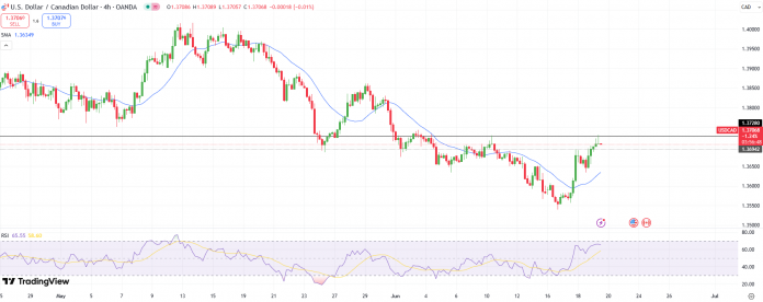 The USD/CAD 4-hour chart exhibits a check of resistance at 1.3728 adopted by a gentle retreat. Nonetheless, the worth stays properly above the 20-period SMA which is a optimistic signal for the pair. The RSI worth is close to the overbought space which signifies the worth could consolidate round present ranges and revenue taking might be noticed as properly.