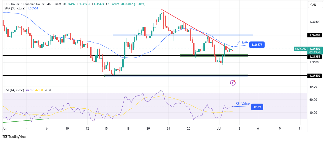 The worth briefly broke under the 1.3625 help degree to make a decrease low. Nonetheless, it pulled again and is now difficult the 30-SMA. A break above the SMA line will sign a bullish sentiment shift. Nonetheless, for bulls to take cost, they need to additionally break above the 1.3700 key degree and begin making increased highs and lows.