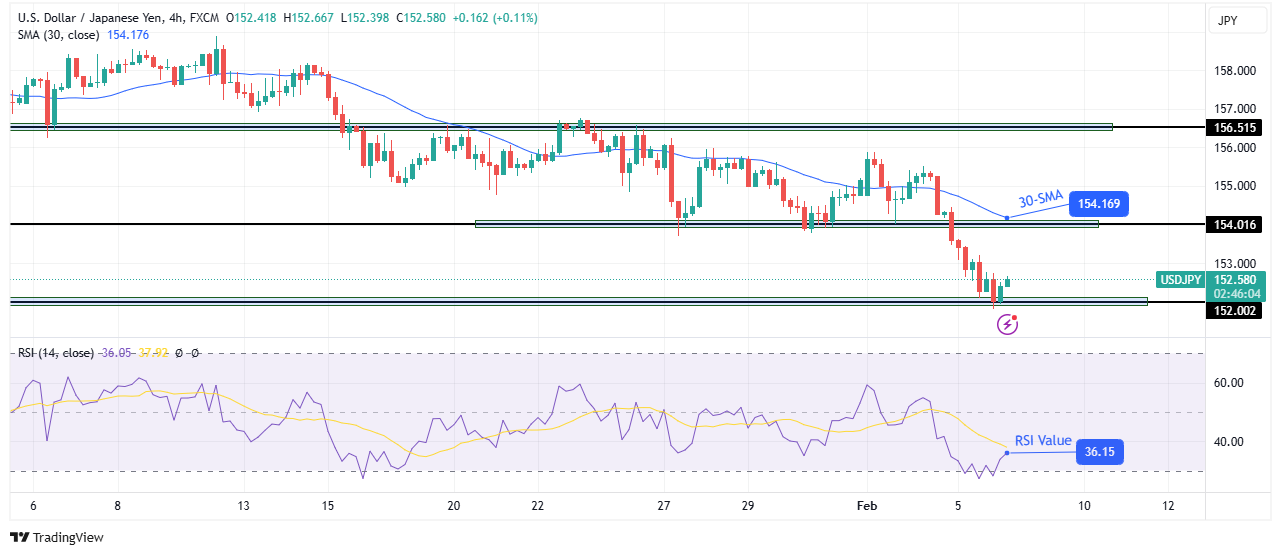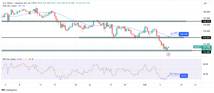 On the technical facet, the USD/JPY worth has paused its decline close to the 152.00 assist stage. The bearish bias is robust as a result of the worth trades nicely beneath the 30-SMA, and the RSI is nearer the oversold area.