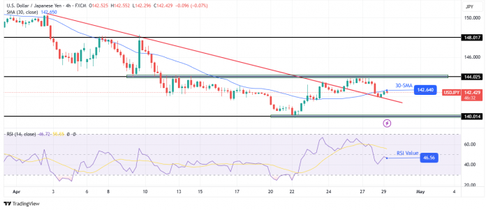 Right here, bulls grew to become stronger, pushing the value above the 30-SMA and the trendline. Moreover, the value pulled again to retest the road. From right here, bulls should break above the 144.02 resistance to make the next excessive and make sure an uptrend. In any other case, the downtrend will proceed.