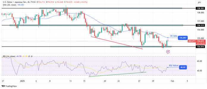On the technical aspect, the USD/JPY value has rebounded after failing to interrupt beneath the 154.01 assist degree. Nevertheless, the value nonetheless trades beneath the 30-SMA, displaying bears are within the lead. Moreover, the RSI favors bearish momentum beneath 50.