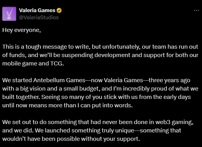 • Valeria Video games has suspended the event of its cellular sport and TCG because of a scarcity of funds and is on the lookout for traders or patrons.