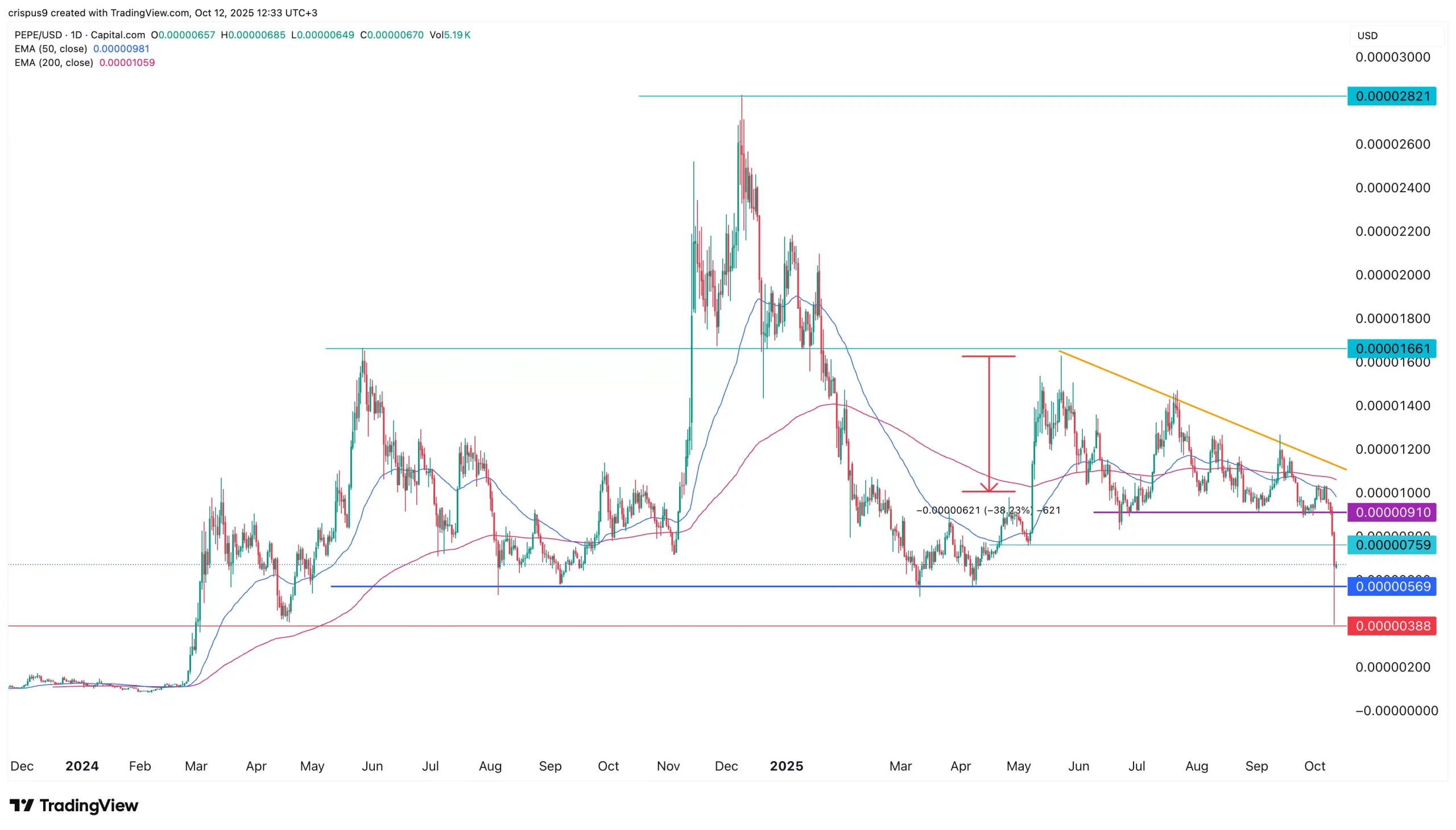 Due to this fact, the most certainly situation is that the Pepe worth will proceed to fall within the coming weeks. The preliminary goal would be the year-to-date low of $0.0000038, adopted by $0.0000020.