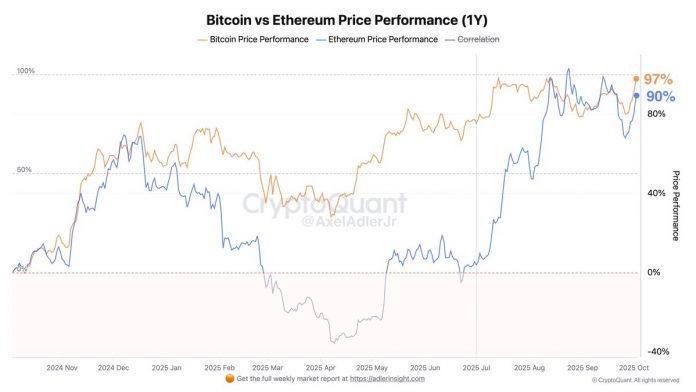 In his newest evaluation, Adler shared a chart evaluating the one-year efficiency of BTC and ETH, measured from October 2024 to immediately. The info reveals that each property have surged over 90% up to now 12 months, regardless of taking totally different routes to reach at comparable outcomes.