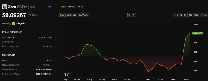 Following the information, ZORA surged almost 59% from $0.056 to $0.089. The momentum has carried into immediately because the coin reached $0.093, its highest value since late August.
