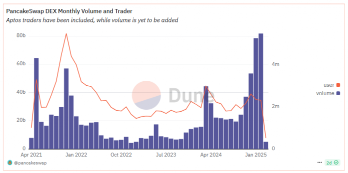 PancakeSwap, a number one decentralized trade (DEX) working on 9 blockchain networks, set a brand new report for buying and selling exercise in January and February 2025. It has achieved the best month-to-month buying and selling quantity since 2021.