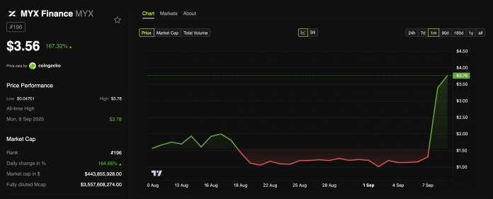 BeInCrypto Markets information confirmed that the altcoin has recorded a 167% surge up to now 24 hours. Earlier at present, the worth reached $3.78, representing a brand new file excessive for MYX. At press time, it traded at $3.56.