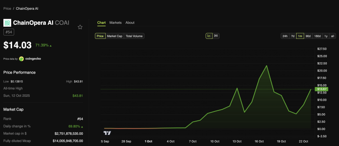 ChainOpera AI’s native token, COAI, has surged over 70% up to now 24 hours, rising because the market’s high gainer.