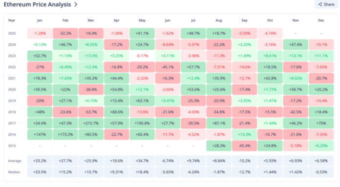 In Q2 of 2025, the Ethereum value ended with a median optimistic return of 36.5% and in Q3, it adopted with a 66.7% return, the very best to this point. With October trending low, there may be already a 4.83% decline this 12 months, however with greater than 2 months to go, there may be nonetheless time for issues to alter.