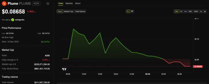However in response to BeInCrypto information, PLUME rapidly went on a roller-coaster journey. Its value dropped sharply to $0.0865 inside a short while, inflicting losses for FOMO merchants.